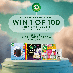(100 winners) Each winner will win the grand prize of one (1) of the following products: (i) Air Wick Plug In, Scented Oils, Hibiscus & Blooming Orchids fragrance; (ii) Air Wick Plug In, Vibrant Scented Oils, Lavender & Waterlily fragrance; or (iii) Air Wick Essential Mist Diffuser, Linen & Petal fragrance (Maximum Retail Value of any Gift is $11.98).