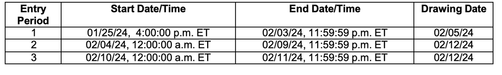 The Sweepstakes Period consists of three (3) entry periods as outlined below (each an “Entry Period”).