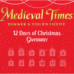 120 randomly selected winners will receive two Medieval Times tickets, expiring in one year, not valid for Saturday or holiday shows. Medieval Times is not responsible for transportation fees, meals, or additional accommodations.