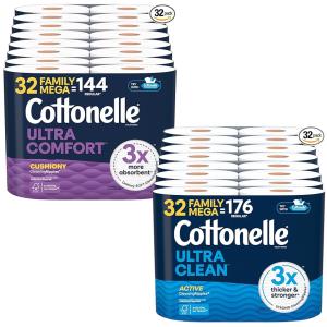 Stock up on Cottonelle Toilet Paper and save big! Grab the 32 Family Mega Roll pack for as low as $17.39 (regularly $34.79) when you clip the 30% coupon and choose Subscribe & Save. The discount varies depending on your subscription tier, so you can get 10% or 20% off plus the extra coupon savings for a total of 40% to 50% off. Choose your favorite type on Ultra Comfort or Ultra Clean and clip the coupon on the product page before adding to your Subscribe & Save order to see the lowest price at checkout.