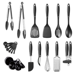 Cuisinart 21 PC Curved Tool Set with soft grip, nonslip ergonomic handles, chrome connection accent. Tool handles are designed to sit flat on countertop and will not roll. Nylon heads are safe for nonstick cookware are heat resistant up to 420 degrees Farenheit. Dishwasher safe with Lifetime warranty. Set that includes solid spoon, slotted spoon, solid turner, slotted turner, can opener, spatula, whisk, Grater, peeler, 4pc measuring cup set, 6pc measuring spoon set, 12" Nylon tipped tongs, 9" Nylon tipped tongs.
