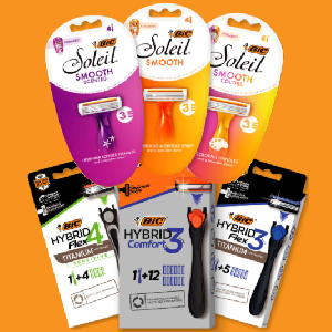 Soleil Smooth, Soleil Smooth Scented, Soleil Smooth Colors (excludes club packs), Soleil Comfort, Soleil Comfort Scented, Soleil® Sensitive, Soleil Sensitive Advanced, Soleil Simply Smooth, Soleil Glide, Click 3 Soleil, Click 4 Soleil, Click 5 Soleil, BIC Flex3, BIC Flex4, BIC Flex5, BIC Flex2 Hybrid, BIC Hybrid 3 Flex, BIC Hybrid 4 Flex, BIC Hybrid 5 Flex, BIC Hybrid 3 Comfort, BIC Comfort Twin, BIC Comfort 3, BIC Comfort 3 Advanced, BIC Deuce, BIC 3, BIC Sensitive, BIC Twin Select, BIC Silky Touch Sensitive ,BIC Silky Touch 1, BIC Silky Touch 3, BIC Silky Touch, or BIC Sensitive 2 razor packs.