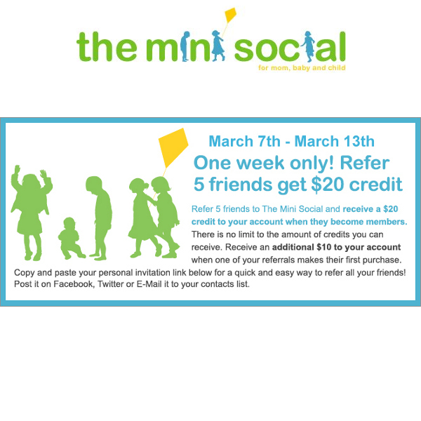 Free Credit to Mini Social - The Mini Social has a special promotion going on March 7th - March 13th. Refer 5 friends and receive a FREE $20 credit to your account when they become members. There is not limit to the amount of credits you can receive, so start spreading the news!