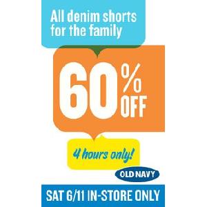 60% Off Old Navy Denim Shorts - Saturday, June 11th from 7-11 am only, get 60% off all denim shorts in-store at Old Navy. Get there early – most stores open at 7am. Check with your local store for hours.