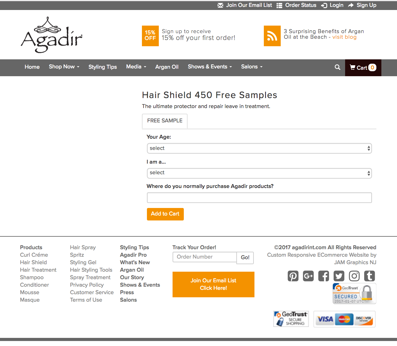 Agadir is offering up a FREE Sample of Argan Oil Hair Shield 450 Hair Treatment with free shipping! Click here and answer 3 quick questions then "Add to cart". Select "Checkout as Guest" or create a free account if you'd like then complete your order. No payment info is required. This sample offer will only available while supplies last so don't delay.
