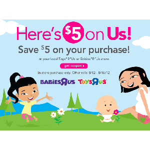 Toys R Us & Babies R Us Off - Woo Hoo! Here's a HOT Toys R Us and Babies R Us coupon good for $5.00 off your in-store purchase. There is no minimum purchase required so you could possibly get something totally FREE!. The coupon is valid August 12, 2012 through August 16, 2012. Print yours now because there is no telling when it could disappear.