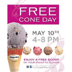 Free Haagen-Dazs Cone 5/10 - May 10th is FREE Cone Day at Haagen-Dazs. Stop by a participating Haagen-Dazs Shop between 4-8 pm and enjoy a scoop of your favorite ice cream flavor absolutely FREE. With so many delicious flavors, it'll be a tough decision. What flavor will you choose.?