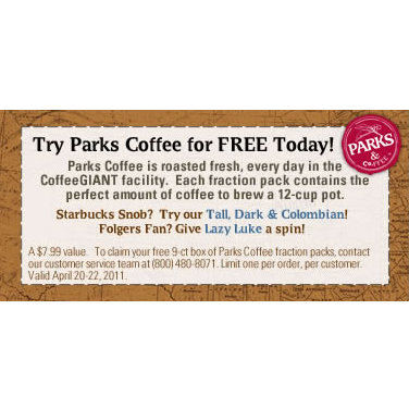 FREE Parks Coffee 9-ct Box - CoffeeGIANT is offering a free 9-ct box of Parks Coffee fraction packs, a 7.99 value! Just contact their customer service at the number below to request yours. They are getting swamped with calls so when you do get through, you will asked for your name & phone number then they'll tell you someone will be calling you back.