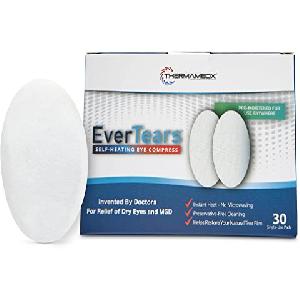 Invented by doctors to provide instant moist heat at the precise temperature needed to help unblock eyelid glands that help hold in more of the eye's natural moisture. 1 individually wrapped moist compress treats both dry eyes in 5 mins - - not 15-20 mins like heated masks. EverTears fit directly onto eyelids to focus heat where it’s needed.