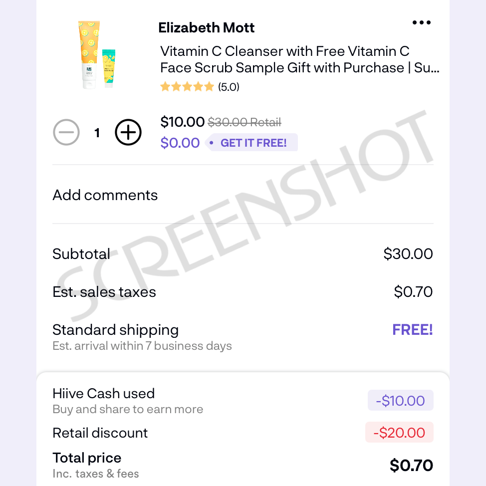 Get a FREE full size Elizabeth Mott Sure Thing! Face Cleanser ā that comes with a travel size sample of Vitamin C Face Scrub ā when you download the Hiive app (iOS only) and sign up as a new user! This same product sells for $16.99 on Amazon but you can get it FREE with this offer! Go here and create your account to get a free $10 credit that will automatically apply at checkout. Anything $10 or less will be free. You may need to pay a small amount for tax, depending on your shipping address (we had to pay $0.70 in FL).