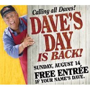 Free Food on Dave's Day - August 14th is Dave's Day at Famous Dave's Restaurants! If your name is Dave, David or Davey, you can get a FREE ENTRÉE (up to $15) on Sunday, August 14! And if your middle name is Dave, David or Davy you’ll get your entrée for half price (up to $7.50)! Be sure to tell Dave.!!