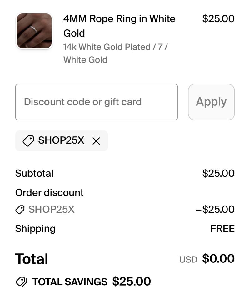 Right now in the Shop app, you can use the code SHOP25X on any purchase from The GLD Shop to get $25 off! Select the free shipping option at checkout and uncheck shipping protection to get a $25 item (like the 4mm Rope Ring in White Gold) totally free.