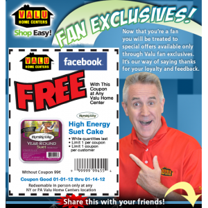 Free Suet Cake Coupon - If you live in NY or PA and have a Valu Home Centers near you, head over to their facebook page to snag a printable coupon for a free High Energy Suet Cake.