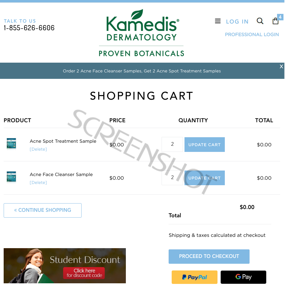 Kamedis Dermatology is offering 4 FREE Acne Care Product Samples (2 FREE Acne Spot Treatment Samples and 2 FREE Acne Face Cleanser Samples) with FREE Shipping. Click this link then click "Add to Cart" to add 2 acne spot treatment samples to your cart and the 2 acne face cleanser samples will be automatically added. Shipping is currently free so no payment info required. While supplies last.