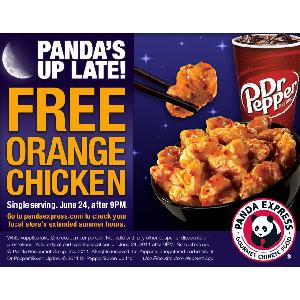 Free Orange Chicken Coupon - Grab this HOT printable coupon from Panda Express then take it to your local store to redeem for a FREE single serving of Orange Chicken. Valid June 24th, after 9pm only. No purchase necessary.