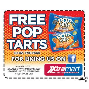 Free Pop Tarts at Xtra Mart - Xtra Mart is offering a printable coupon good for a free 2-pack [3.5 ounce] of Pop Tarts. Just click the green above, print the coupon then take it in to your local Xtra Mart convenience store to redeem for your freebie. Coupon is valid at participating locations through February 7, 2013. Limit 1 per customer, while supplies last.