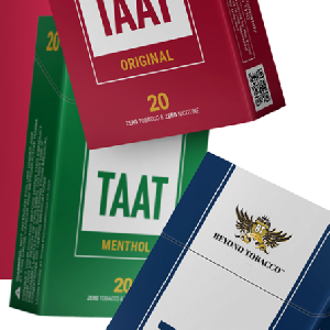 The Beyond Tobacco™️ base material of TAAT™ is tobacco and nicotine-free but, providing current smokers of legal age the choice to keep the experience of smoking, but without consuming nicotine. Thanks to a patent-pending refinement technique, Beyond Tobacco™️ gives off a smell and taste that is similar to actual tobacco. This similarity contributes to an experience that is expected to be highly familiar to smokers.