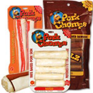 Pork Chomps are the long-lasting chews that dogs love. They are made of baked pork skin, which is easily digestible and naturally delicious. Their great taste is only enhanced by Pork Chomps' intense flavor stripz in peanut butter, bacon, chicken and pepperoni flavors. That's part of the reason why dogs choose Pork Chomps 9 to 1 over ordinary rawhide in independent taste testing!