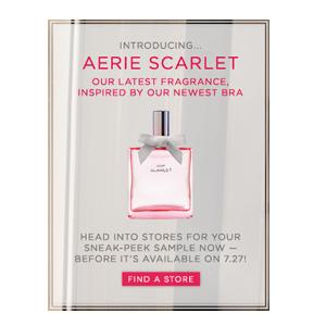 FREE Aerie Scarlet Sample - Aerie has come up with a new fragrance that they are releasing July 27, 2012. They want you to come and get a free sample of this new fragrance in stores before its release so you can see how you like it. All you need to do is go to the website and click the 'Find Store' button and you will be able to find a store near you so you can get your free sample.
