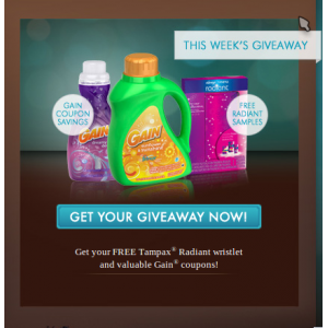 Tampax Wristlet & Gain Coupons - My Black is Beautiful is giving away FREE Tampax Radiant Wristlets and valuable Gain coupons through July 6, 2012. Just head over and "Like" their facebook page and click on the "MBIB" link at the top. Click the blue "Get your giveaway now!" button then fill out the form with your info. Your free stuff should arrive in 4-6 weeks.