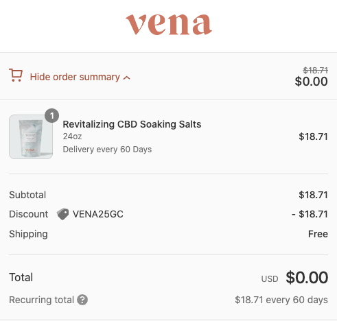 Hurry to score a $25 Off Vena CBD Order and get something FREE! They have CBD drinks, CBD Soaking Salts, CBD Skincare, Gummies and more. Just use the code VENA25GC at checkout, no minimum purchase required. Select the Subscribe & Save to get FREE Shipping on your order. Free shipping may vary by product but it worked on the bath salts for us. Cancel anytime.