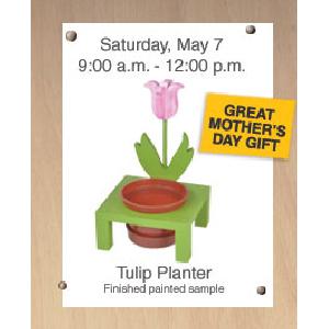 FREE Tulip Planter - Bring your child to The Home Depot on Saturday, May 7th from 9am-12pm for the Kids How-To Workshops and they can build a Tulip Planter for Mom for FREE! In addition to the newly constructed project kit, each child receives a kid-sized orange apron, similar to The Home Depot associates' aprons, and an achievement pin.